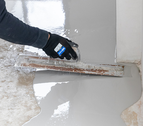 Gebruik een lijmkam en/of vlakke vloerspaan om het uitvloeien van deegalisatie te helpen. Zorg dat alle hoekjes van de vloer goed opgevuld zijn. Laat de eerste laag minstens 24 uur drogenals je meerdere lagen egalisatie wilt aanbrengen. Wacht minstens 24 tot 36 uur als je direct met de vloerafwerking wilt starten.